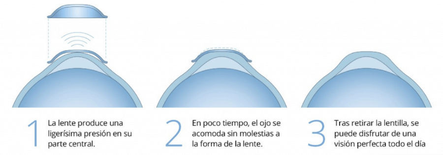 El tratamiento consiste en una modificación temporal de la curvatura de la córnea, que se realiza durante las horas de sueño, cuando deben llevarse puestas, consiguiendo así que durante el día la visión quede corregida y poder ver sin necesidad de usar gafas o alguna corrección durante el día.